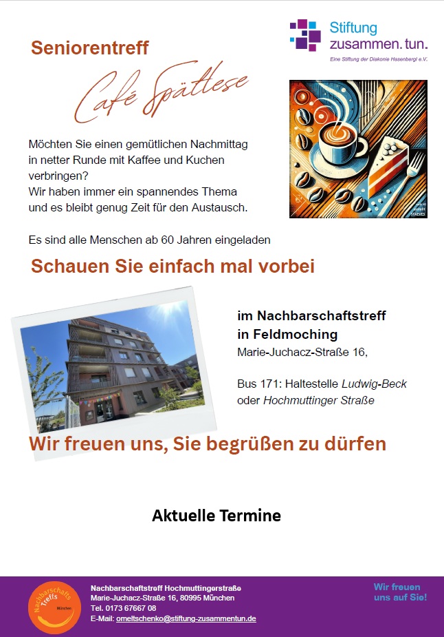 Wir freuen uns Sie begrüßen zu dürfen im Nachbarschaftstreff Feldmoching (Marie-Juchacz-Str. 16). Sie erreichen uns mit dem Bus 171, Haltestelle Ludwig-Beck-Straße.